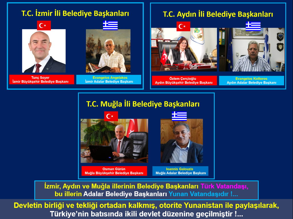 İzmir, Aydın ve Muğla illerimiz birisi Türk diğeri Yunan olmak üzere ikişer Belediye Başkanı tarafından yönetiliyor.