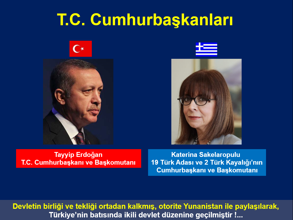 19 Türk Adası ve 2 Türk Kayalığı’nın Cumhurbaşkanlığı ve Başkomutanlık görevini Yunan Cumhurbaşkanı Madam Katerina yürütüyor. Yunan Cumhurbaşkanları, İzmir, Aydın ve Muğla İl sınırları içindeki adalarımıza elini kolunu sallayarak gelip giderken, saray yandaşları tarafından dünya lideri ilan edilen Tayyip Erdoğan, cesaret edip bu adalara gidemiyor.